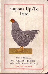 George Beuoy of Kansas was known as the “Capon King”, having promoted the capon as a delicacy, and he sold thousands of capons. He developed, manufactured, and sold the instruments to produce capons for home use. He also published many books, claiming to have sold more than 1,000,000 of them during his lifetime. His books publicized the capon, but also advertised his instruments, and gave instructions for turning cockerels into capons.